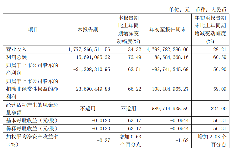 诺德股份10月23日披露2025年第三季度报告显示:前三季度公司实现营业总收入47.93亿元,同比增长29.21%;归母净利润亏损9374.12万元,上年同期亏损2.17亿元;扣非净利润亏损1.08亿元,上年同期亏损2.65亿元。