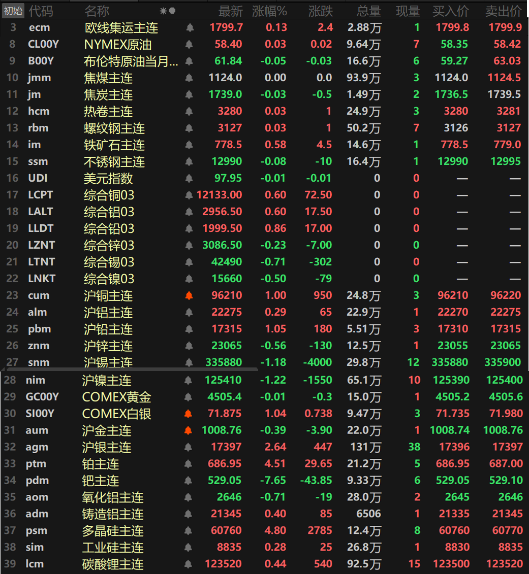 此外,碳酸锂主连涨0.44%,多晶硅主连涨4.8%,工业硅主连涨0.28%。欧线集运主连涨0.13%报1799.7。