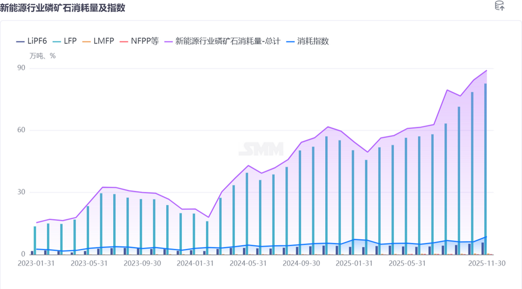 根据新能源行业磷矿石消耗量及指数数据显示,2025年新能源汽车行业磷矿石消耗量持续攀升,年末接近90万吨。主要驱动力来自LFP(磷酸铁锂)、LMFP(磷酸锰铁锂)、LiPF₆(六氟磷酸锂)等电池材料。磷酸铁锂及相关材料对高纯磷酸、工业级MAP的需求拉动日益明显,成为磷化工企业转型布局的重点方向。