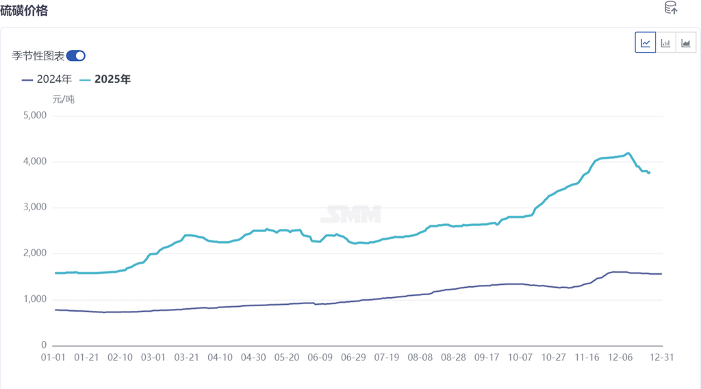 2025年硫磺价格较2024年显著攀升。年初价格约1500元/吨,一路攀升至年末的4000元/吨(期间峰值超过4000元/吨),虽然年末略有回落,但全年均价较2024年实现翻倍。硫磺作为磷酸等磷化工产品的核心原料,其价格上涨成为2025年行业生产成本抬升的主要推动力。