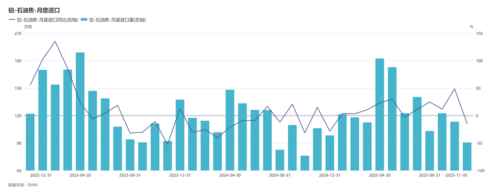 据海关数据显示,2025年11月我国石油焦进口90.55万吨,环比减少20.04%,同比减少14.62%;粗略估计11月石油焦进口价格为233.25美元/吨,环比增加3.66%,同比增加50.75%。2025年我国石油焦累计进口总量约为1399.16万吨,同比增加12.69%。