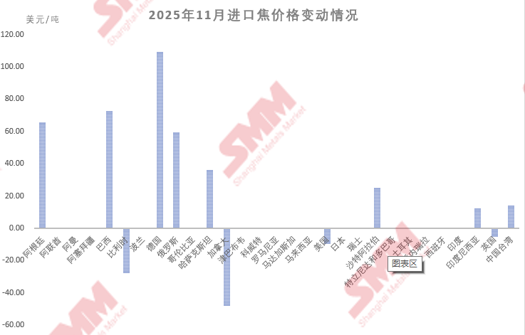 从进口价格方面来看,2025年11月石油焦进口价格涨多跌少,10月石油焦进口均价约为233.25美元/吨,环比增加3.66%。本月从德国、巴西及阿根廷进口石油焦价格涨幅较大,其涨幅在65美元/吨以上,从加拿大、比利时进口石油焦价格下滑明显,跌幅在25-50美元/吨。