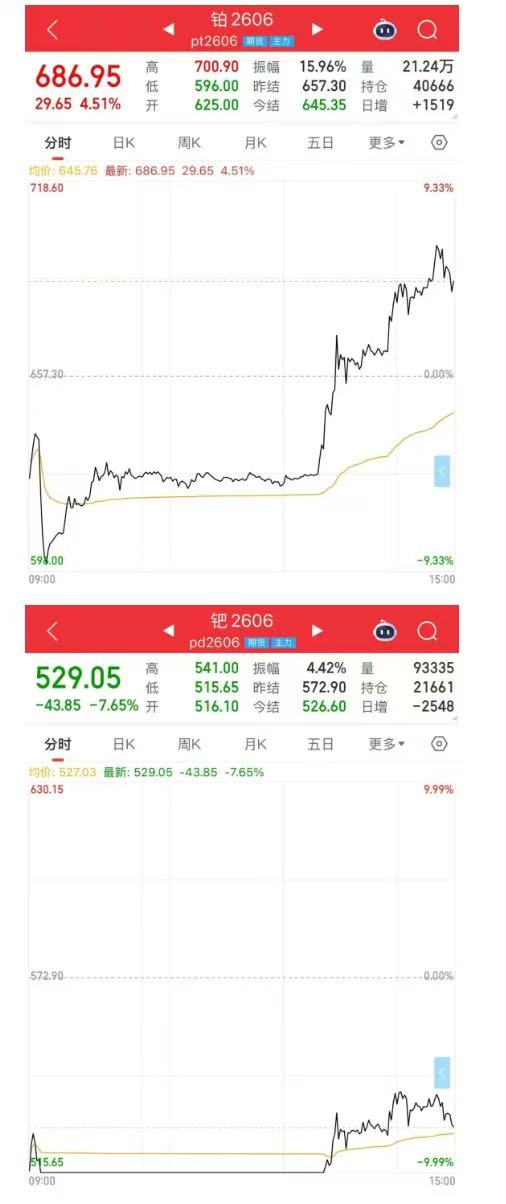 一德期货分析师张晨认为,最近宏观环境、现货供应收紧与市场看多情绪升温等因素共振,驱动铂、钯期货价格上涨。12月24日晚间,外盘铂、钯价格大幅冲高回落,加之海外市场因圣诞假期休市,市场看多情绪逐步回落,从而带动内盘铂、钯期货价格回落。
