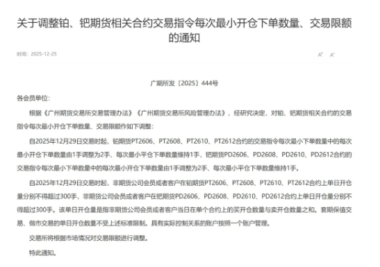25日晚间,广期所调整铂、钯期货相关合约交易指令每次最小开仓下单数量、交易限额。