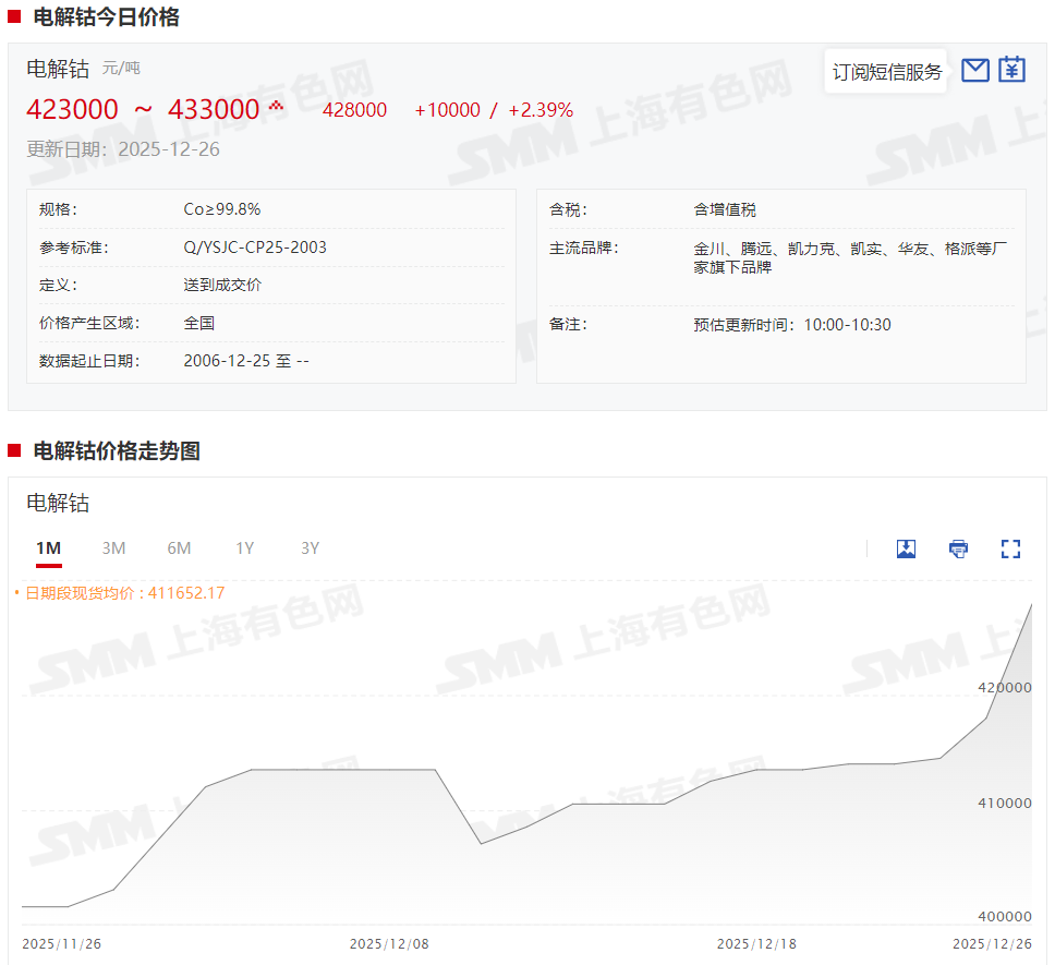 据SMM现货报价显示,本周电解钴现货报价快速上涨,截至12月26日,电解钴现货报价涨至42.3~43.3万元/吨,均价报42.8万元/吨,较12月19日上涨1.45万元/吨,涨幅达3.51%。