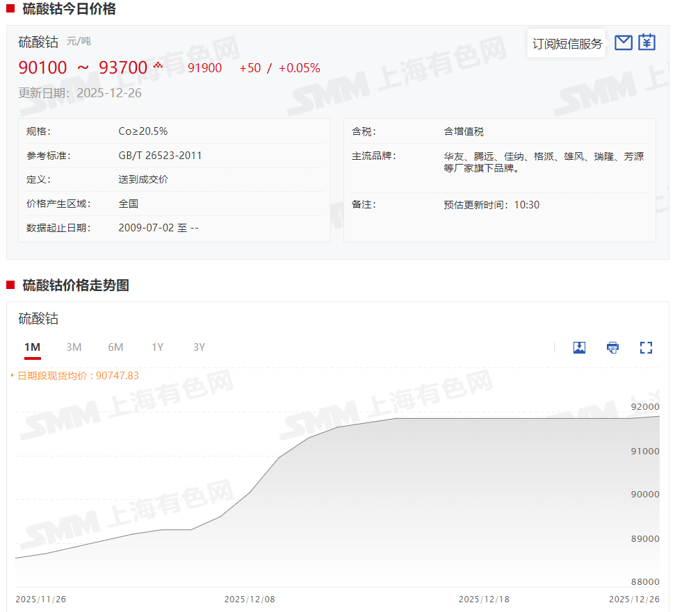 据SMM现货报价显示,本周硫酸钴现货报价前期维稳运行,仅在最后一个交易日单日小幅上涨50元/吨,截至12月26日,硫酸钴现货报价涨至9.01~9.37万元/吨,均价报9.19万元/吨,较12月19日涨幅达0.05%。