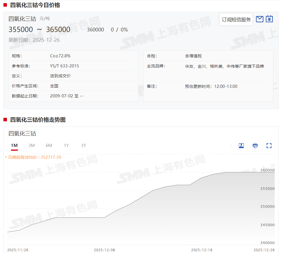 据SMMM现货报价显示,本周四氧化三钴现货报价在周初小幅上涨之后暂稳运行,截至12月26日,四氧化三钴现货报价涨至35.5~36.5万元/吨,均价报36万元/吨,较12月19日上涨500元/吨,涨幅达0.14%。