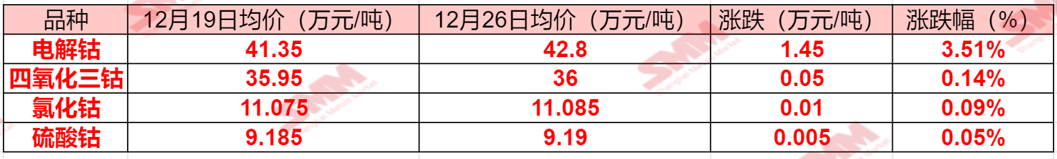 SMM 12月26日讯:本周钴系产品报价一同上涨,其中电解钴价格因年末供应收缩加之价差收敛,本周现货报价快速上涨,单周上涨1.45万元/吨。而氯化钴市场供应紧缺的格局也仍未改变,据SMM了解,氯化钴市场原料紧缺已成常态,贸易商和回收商库存几乎见底,中小冶炼厂的“余粮”可能撑不过12月至明年1月……SMM整理了本周钴系产品价格变动情况,具体如下: