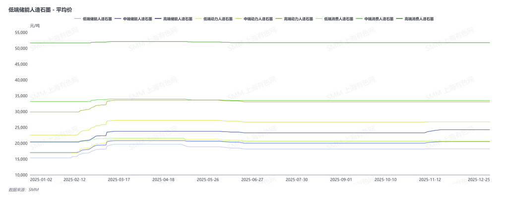 2025年Q4,负极材料市场呈现“成本支撑弱、需求有韧性、产量先增后稳、价格小抬后趋稳”的运行特征。成本端,核心原料焦价小幅下滑,成本支撑减弱;需求端,10-11月,新能源汽车与储能领域的旺季效应延续,电芯厂产量稳步增长,持续带动负极材料需求强劲释放。12月,受年末行业季节性调整影响,电芯企业排产预计出现下滑,但排产降幅显著低于往年,负极材料需求端仍具备较强韧性;供应端,负极企业前期紧跟需求节奏积极提产,产能释放充分;年末受下游电芯排产小幅下滑以及自身控制库存影响,预计产量将出现小幅回落;价格端,10-11月,供需双旺叠加成本上行,共同推动负极材料价格小幅抬升;12月,虽成本端小幅下滑对价格支撑力度减弱,但一二线负极企业有效产能偏紧,尾部企业短期内又难以弥补需求缺口,因此最终12月负极材料价格未现下滑,整体持稳运行。