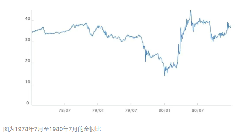 在现货市场完成布局后,亨特兄弟转向期货市场,在纽约金属交易所大举建立多头头寸推高COMEX白银期货价格,形成“现货短缺—期货涨价—空头恐慌”的市场状态。随后,投机资金跟风涌入,推动白银价格从1979年8月的6美元/盎司飙升至1980年2月的35.52美元/盎司,半年内涨幅高达492%。同期金银比从30比1剧烈收缩至12比1。