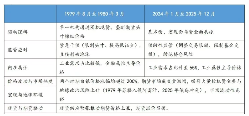 市场结构与监管应对的差异则直接影响了两场行情的稳定性。1980年市场结构高度集中,亨特兄弟垄断大量现货与期货头寸,形成事实上的市场操纵,监管层只能采取被动措施,通过修改交易所规则、限制持仓规模、提高保证金等方式刺破泡沫,最终导致价格崩盘;2025年市场结构呈现多机构分散持仓的特征,无单一主体能够垄断市场,监管层采取预防性、市场化的监管措施,通过调整交易限额、限制定投等方式防范挤仓风险,引导市场理性交易。