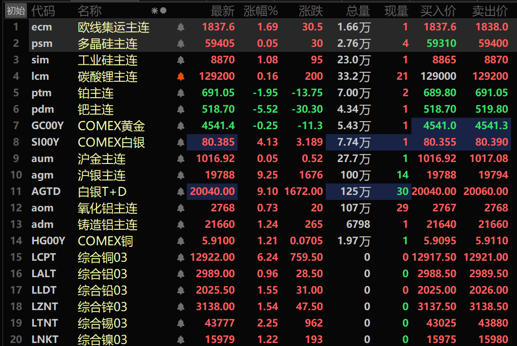 贵金属方面,截至11:46分,COMEX黄金跌0.25%;COMEX白银涨4.13%,盘中刷新历史新高至82.67美元/盎司。内盘贵金属方面:沪金主连涨0.05%,盘中刷新历史新高至1024元/克;沪银主连涨9.25%,盘中刷新历史新高至19998元/千克。
