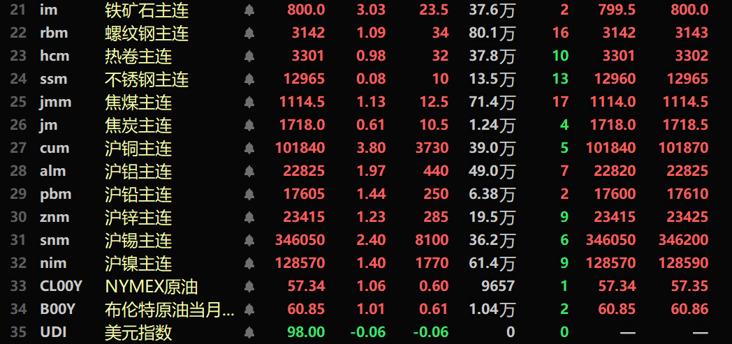 黑色系均飘红,铁矿涨3.03%,螺纹涨1.09%,热卷涨0.98%,不锈钢涨0.08%。双焦方面:焦煤主力合约涨1.13%,焦炭主力合约涨0.61%。