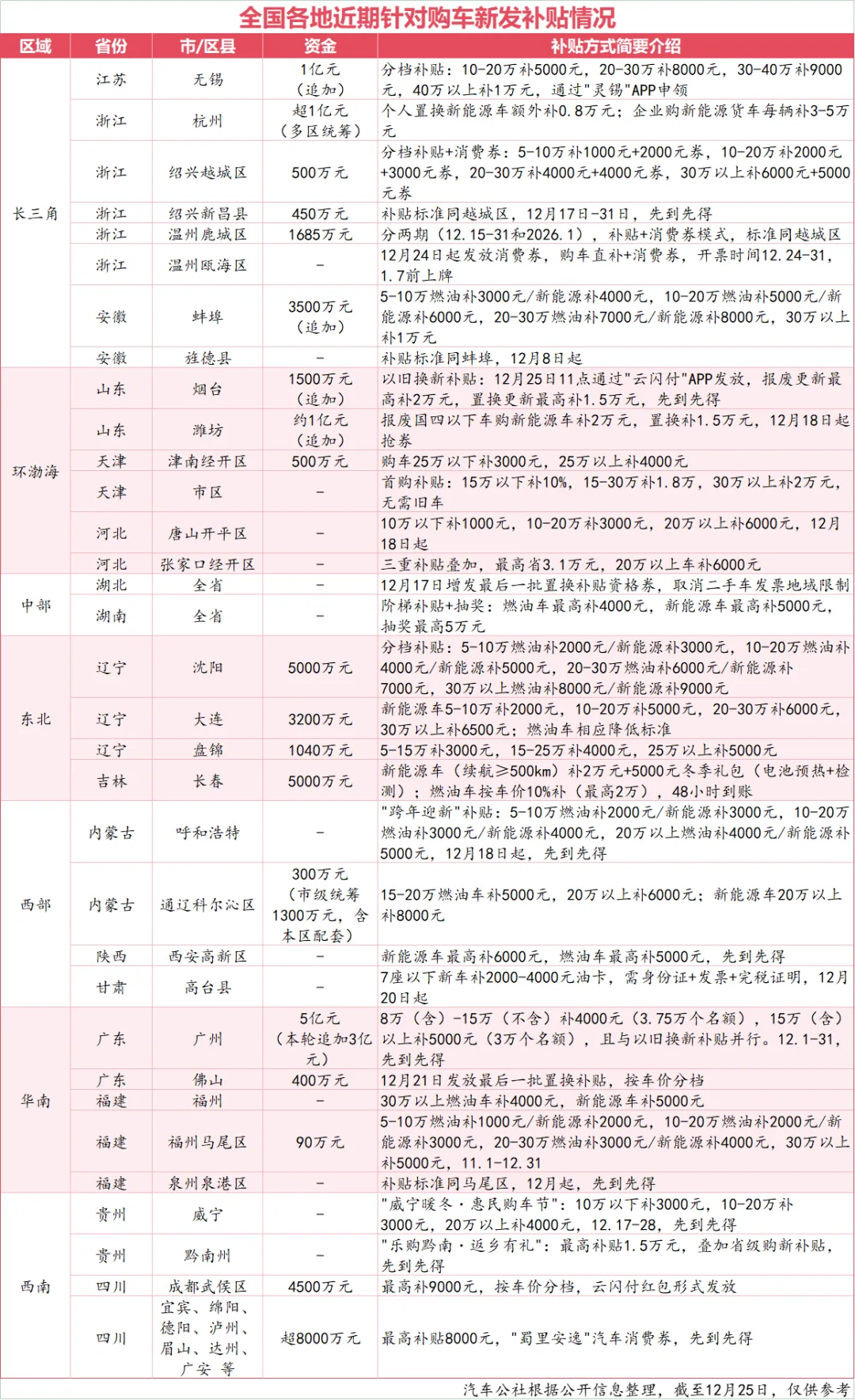 广州追加3亿元、无锡加码1亿元、潍坊再新增1亿补贴……近期,全国各地至少有超过30个城市密集抛出大额购车补贴,为年末车市注入强心剂。