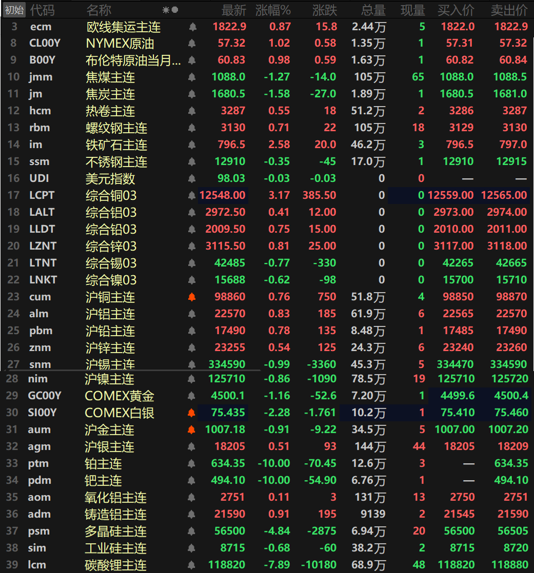 此外,碳酸锂主连午后一路走低,盘中一度触及跌停,截止收盘,其以7.89%的跌幅报118820元/吨。工业硅主连跌0.68%,多晶硅主连跌4.84%。欧线集运主连涨0.87%报1822.9。