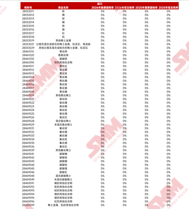 SMM整理了稀土相关进出口暂定税率,具体对比情况如下:
