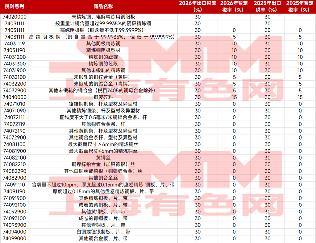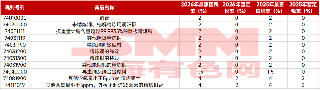 据SMM了解,2026年具体涉及铜相关产品进出口关税情况分别如下: