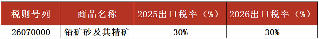 一、铅矿砂及其精矿:2025年的出口关税税率维持在30%。