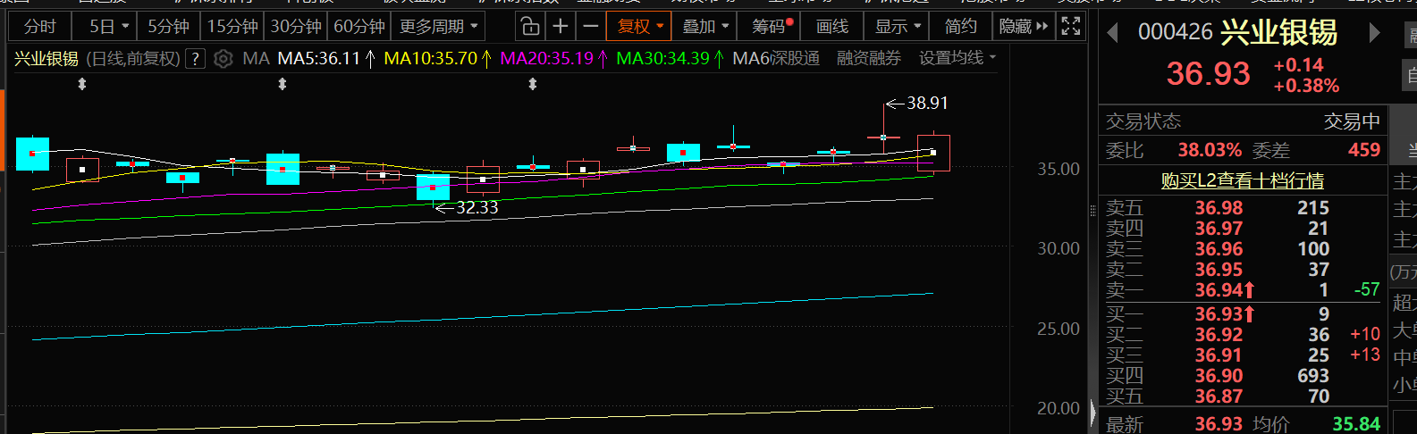 12月30日,兴业银锡股价出现上涨,截至30日14:04分,兴业银锡涨0.38%,报36.93元/股。