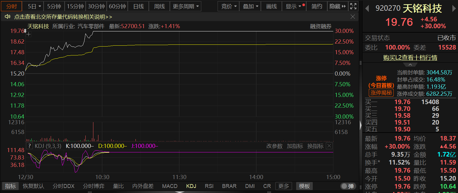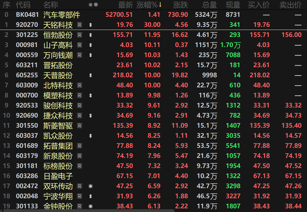 SMM 12月30日讯:今日,汽车零部件板块盘中拉升,指数盘中一度涨近2%,最高触及52921.3的高位,刷新2025年9月18日以来的新高。个股方面,天铭科技30CM涨停,恒勃股份涨逾11%,山子高科、万向钱潮、晋拓股份等6股涨停。