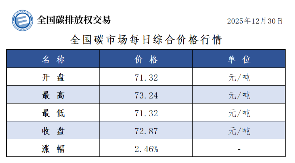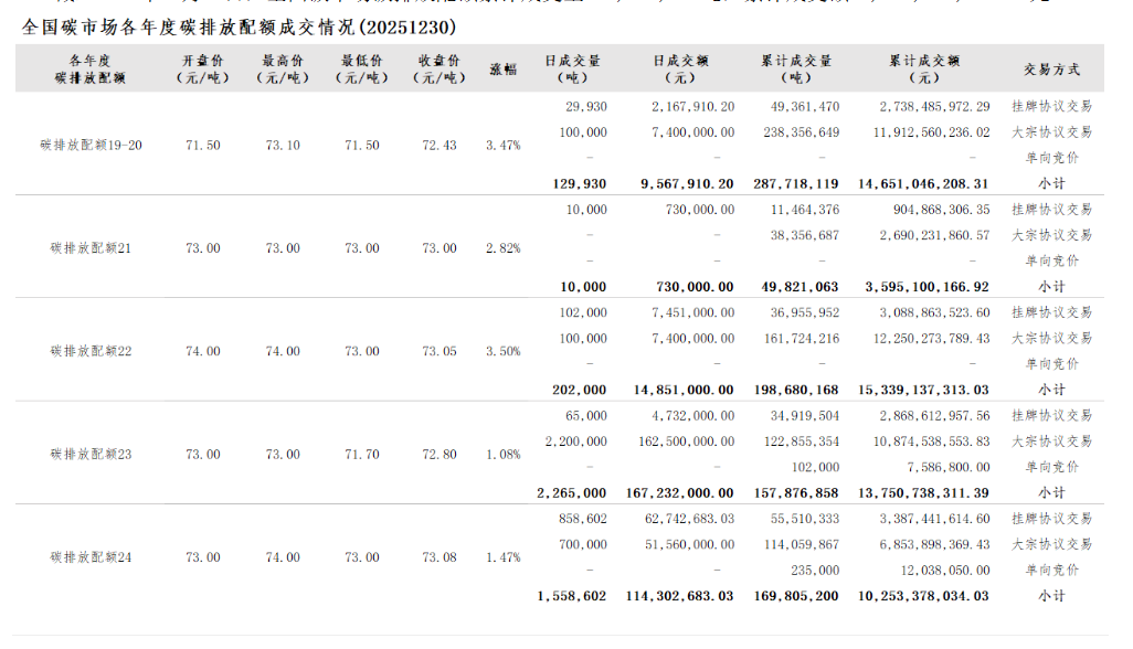 2025年1月1日至12月30日,全国碳市场碳排放配额成交量233,632,744吨,成交额14,556,672,930.17元。