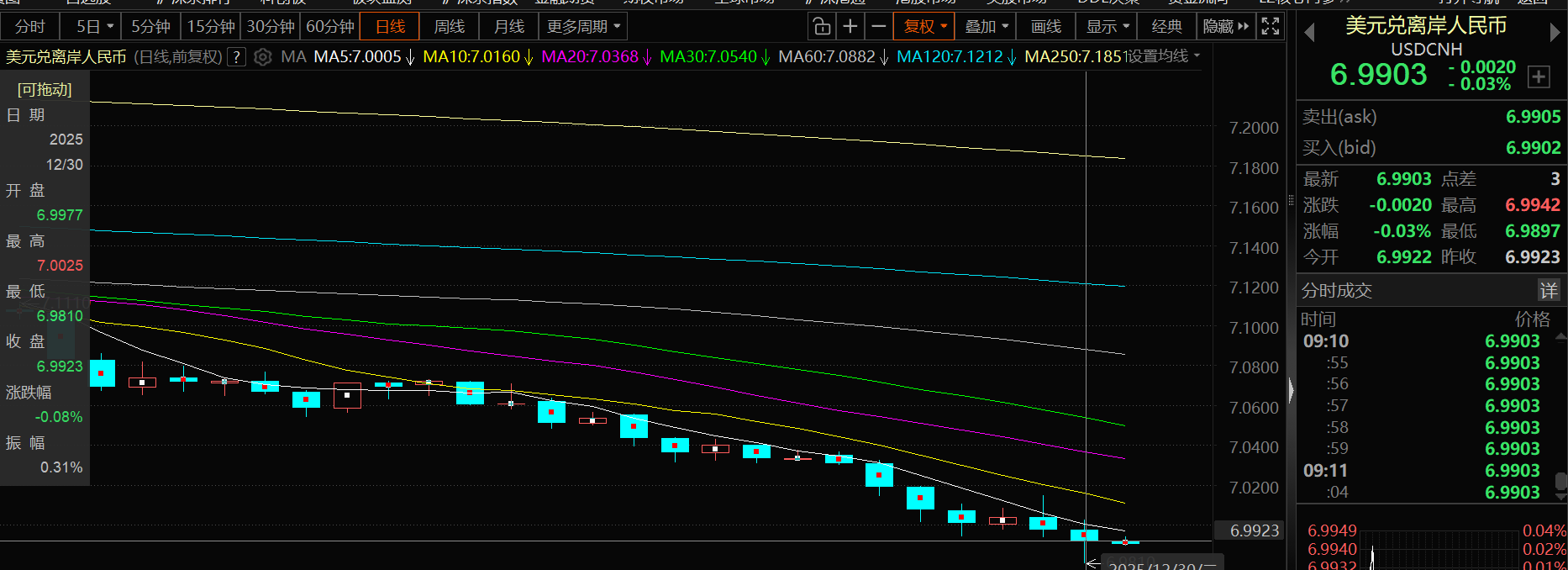 隔夜离岸人民币继续上涨,美元兑离岸人民币12月30日最终收跌0.08%,报6.9923,盘中最低跌至6.9810。12月31日,美元兑离岸人民币继续走弱,截至12月31日9:11分,美元兑离岸人民币跌0.3%,报6.9903。