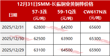 【SMM价格】2025年12月31日长振黄铜棒价格