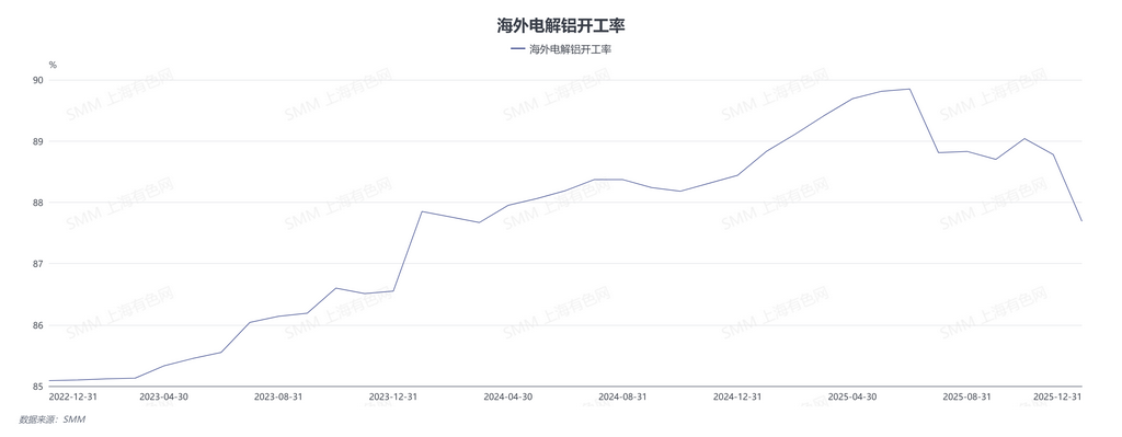 据 SMM 统计,2025 年 12月海外电解铝总产量同比增长 2.2%;月度平均开工率为 87.7%,环比下降1.1个百分点,同比降低0.8个百分点,主因印尼新建电解铝项目投产,但运行产能处于爬坡阶段,稀释海外电解铝开工率。截至12月末,2025年累计产量已同比增加2.8%。
