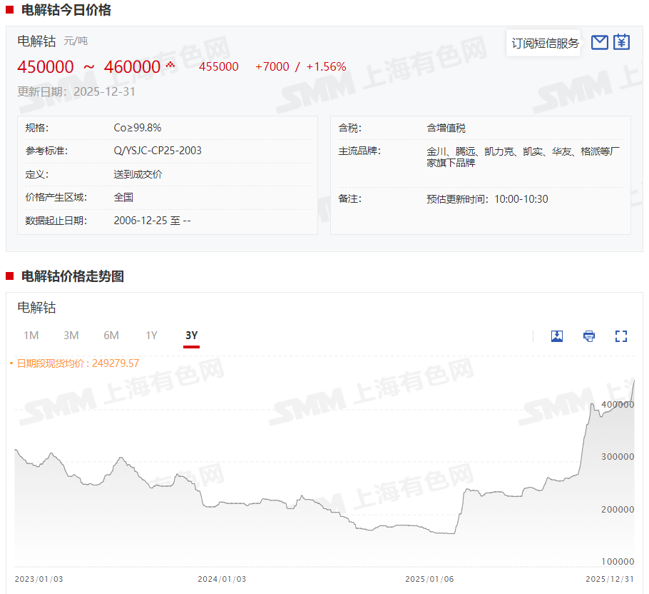据SMM现货报价显示,本周电解钴现货报价接连跳涨,截至12月31日,电解钴现货报价涨至45~46万元/吨,均价报45.5万元/吨,较12月26日上涨2.7万元/吨,涨幅达6.31%。