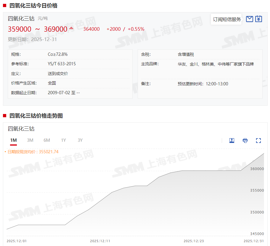 据SMM现货报价显示,本周四氧化三钴现货报价在今年最后两个交易日迎来上涨,截至12月31日,四氧化三钴现货报价涨至35.9~36.9万元/吨,均价报36.4万元/吨,较12月26日上涨4000元/吨,涨幅达1.11%。