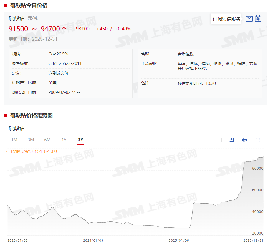 据SMM现货报价显示,硫酸钴现货报价也在上周持稳多日之后迎来接连上涨,截至12月31日,硫酸钴现货报价涨至9.15~9.47万元/吨,均价报9.31万元/吨,较12月26日上涨1200元/吨,涨幅达1.31%。