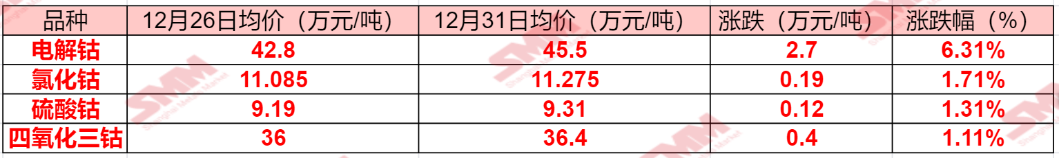 SMM 12月31日讯:2026年元旦前最后一个周,国内钴系产品现货报价的涨幅十分可观,电解钴在连涨三个交易日后累计上涨2.7万元/吨,其余钴盐的价格也均录得不同程度的上涨,为2025年的钴市场画上了一个圆满的句号!SMM整理了2025年最后一周钴市场的产品价格变动情况,具体如下: