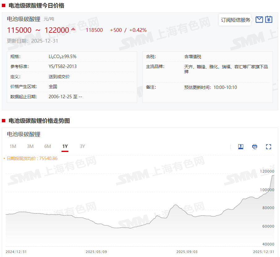 截至12月31日,电池级碳酸锂现货均价涨至11.5~12.2万元/吨,均价报11.85万元/吨,较2024年年底的75050元/吨上涨43450元/吨,涨幅达57.89%。