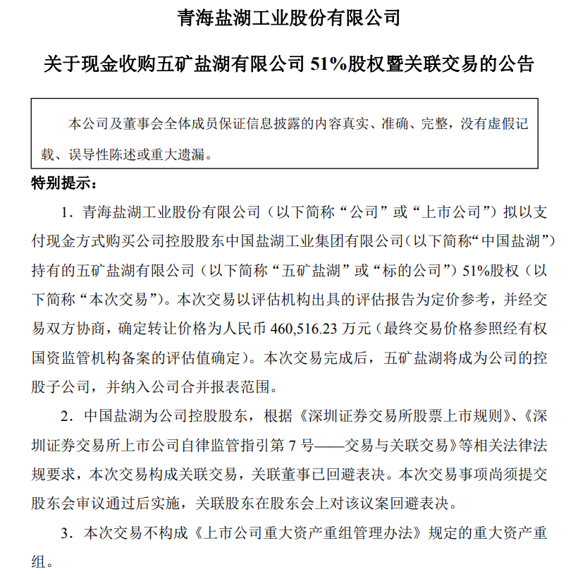 SMM 12月31日讯:12月30日,盐湖股份发布公告称,公司拟以46.05亿元现金收购控股股东中国盐湖工业集团有限公司持有的五矿盐湖有限公司51%股权。本次交易完成后,五矿盐湖将成为公司的控股子公司,并纳入公司合并报表范围。