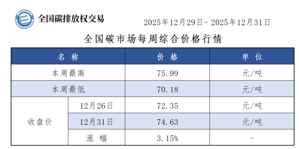 本周全国碳市场综合价格行情为:最高价75.99元/吨,最低价70.18元/吨,收盘价较上周五上涨3.15%。