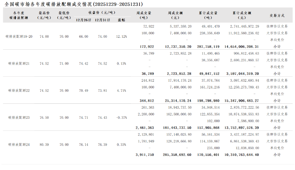 2025年1月1日至12月31日,全国碳市场碳排放配额成交量234,597,856吨,成交额14,629,891,128.06元。