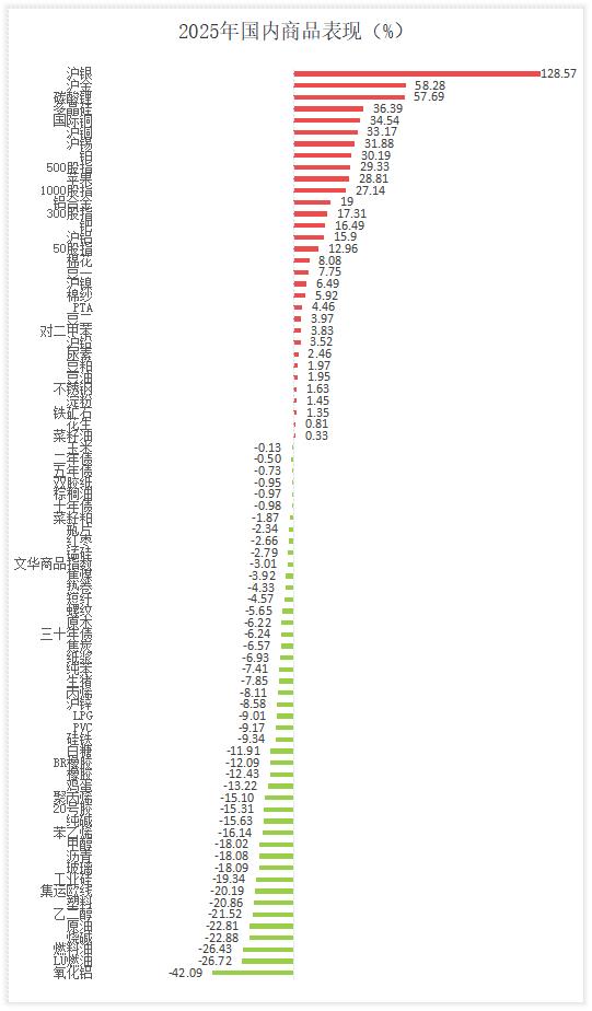 国内商品方面,2025年是贵金属“史诗级”一年,金银均创纪录新高,沪金突破1000元大关,年度涨幅超过58%。沪银逼近20000元关口,年度涨幅近130%;有色金属全面开花,沪铜强势突破10万大关,再创历史新高,年度大涨33%;追踪国内商品走势的文华商品指数2025年下跌3.01%。