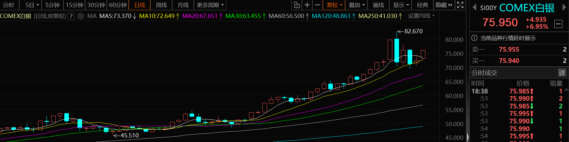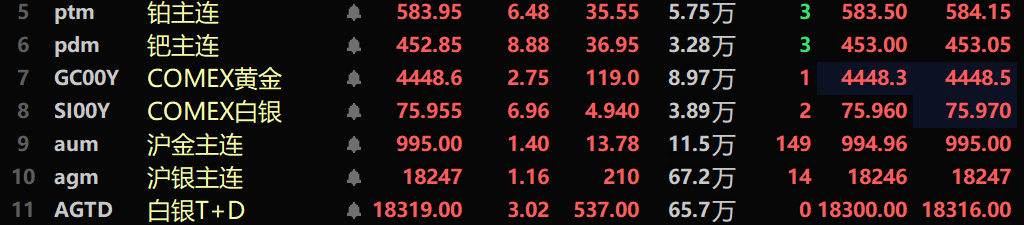 美国对委内瑞拉采取相关军事行动、俄乌冲突持续发酵等地缘局势变化,引发市场对地缘风险的担忧升温,避险需求显著攀升,为贵金属价格上行提供强劲支撑。此外,美联储降息预期主导的货币宽松周期预期未发生转向,市场对流动性宽松的判断进一步强化贵金属配置价值;多国央行延续增持黄金的操作,为贵金属市场注入长期稳定支撑;白银市场供应偏紧格局延续,尽管国内工业领域交投氛围相对清淡,但珠宝加工等领域的原料采购需求及投资端配置积极性较高,对银价形成有力提振;铂钯品种基本面持续向好等共同推动贵金属期、股价格联袂走强。截至1月5日18:49分左右,铂主连期货涨6.48%,报583.95元/克;钯主连涨8.88%,报452.85元/克;COMEX黄金涨2.75%,报4448.6美元/盎司;沪金主连涨1.4%,报995元/克;COMEX白银涨6.96%,报75.955美元/盎司;沪银主连涨1.16%,报18247元/千克;白银T+D涨3.02%,报18319元/千克。