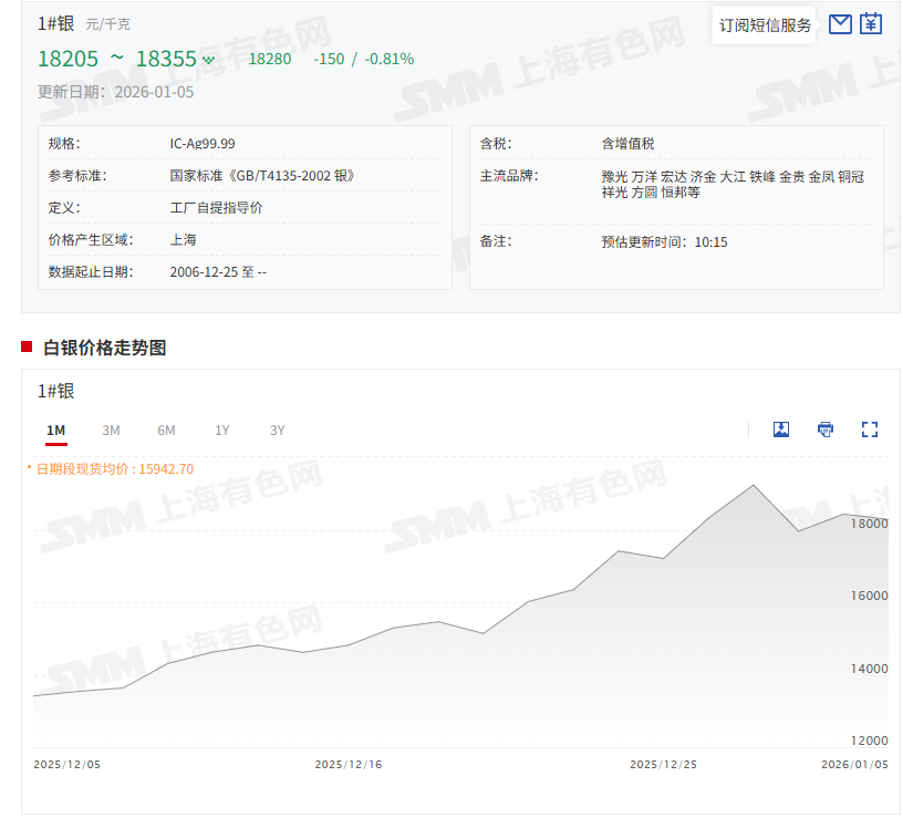 现货市场方面:1月5日,SMM1#白银上午出厂参考均价为18280元/千克,均价较前一交易日跌150元/千克,跌幅为0.81%。据了解,从市场成交结构来看,受银价高位运行影响,下游工业领域采购需求持续寡淡;与之形成对比的是,珠宝加工等领域的原料银采购需求稳步释放,叠加投资端配置热情高涨,对现货价格构成一定的支撑。