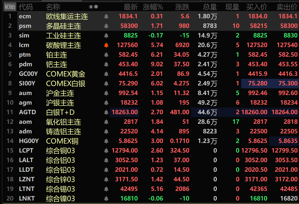 此外,铸造铝主连期货涨4.14%,氧化铝主连涨1.84%。碳酸锂主连涨5.74%。工业硅主连跌0.17%。多晶硅主连涨1.71%。