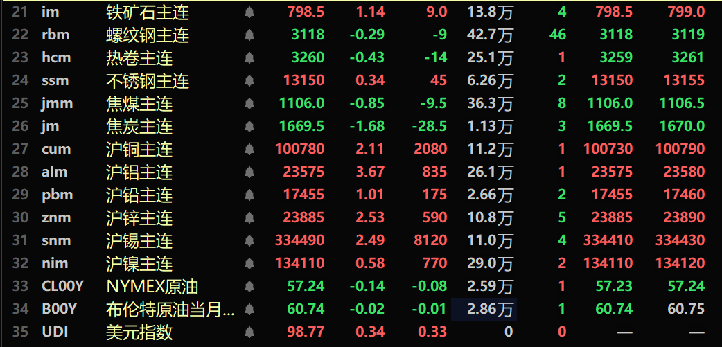 截至午间收盘,内盘基本金属全线飘红,沪铜涨2.11%。沪铝涨3.67%。沪铅涨1.01%,沪锌涨2.53%。沪锡涨2.49%,沪镍涨0.58%。