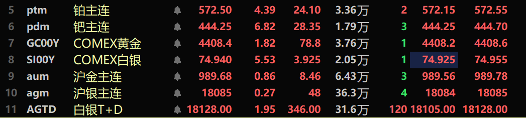 美国对委内瑞拉采取相关军事行动、俄乌冲突持续发酵等地缘局势变化,引发市场对地缘风险的担忧升温,避险需求显著攀升,为贵金属价格上行提供强劲支撑。此外,美联储降息预期主导的货币宽松周期预期未发生转向,市场对流动性宽松的判断进一步强化贵金属配置价值;多国央行延续增持黄金的操作,为贵金属市场注入长期稳定支撑;白银市场供应偏紧格局延续,尽管国内工业领域交投氛围相对清淡,但珠宝加工等领域的原料采购需求及投资端配置积极性较高,对银价形成有力提振;铂钯品种基本面持续向好等共同推动贵金属期、股价格联袂走强。截至1月5日10:15分左右,铂主连期货涨4.39%,报572.5元/克;钯主连涨6.82%,报444.25元/克;COMEX黄金涨1.82%,报4408.4美元/盎司;沪金主连涨0.86%,报989.68元/克;COMEX白银涨5.53%,报74.97美元/盎司;沪银主连涨0.27%,报18085元/千克;白银T+D涨1.95%,报18128元/千克。