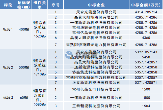 根据公告,此次采购容量为960MW,共分为3个标段,共有9家企业入围,分别是天合光能、高景太阳能、一道新能、华耀光电、亿晶光电、晶澳科技、阿特斯、协鑫集成、正泰新能。
