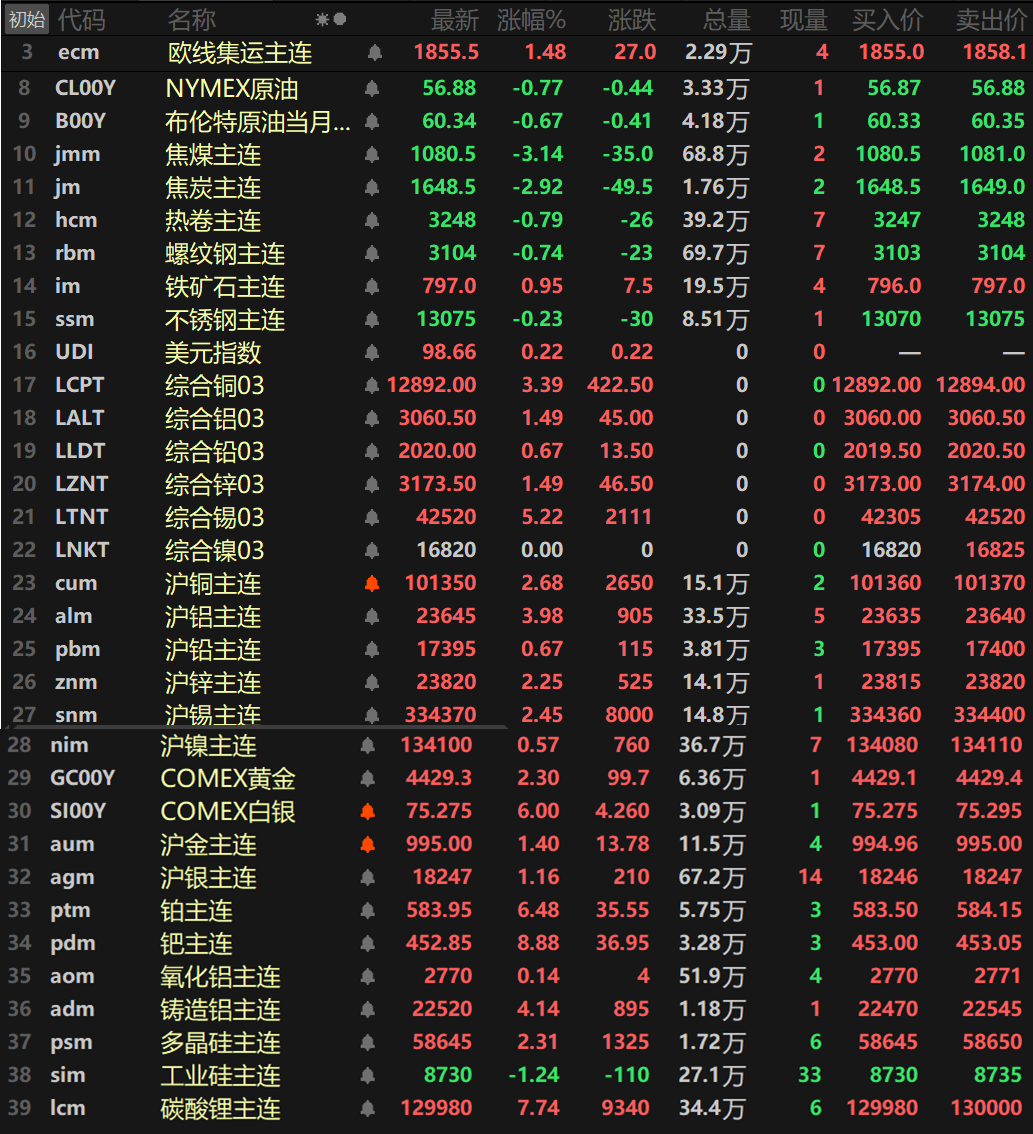 此外,碳酸锂主连涨7.74%,多晶硅主连涨2.31%,工业硅主连跌1.24%。欧线集运主连涨1.48%报1855.5。