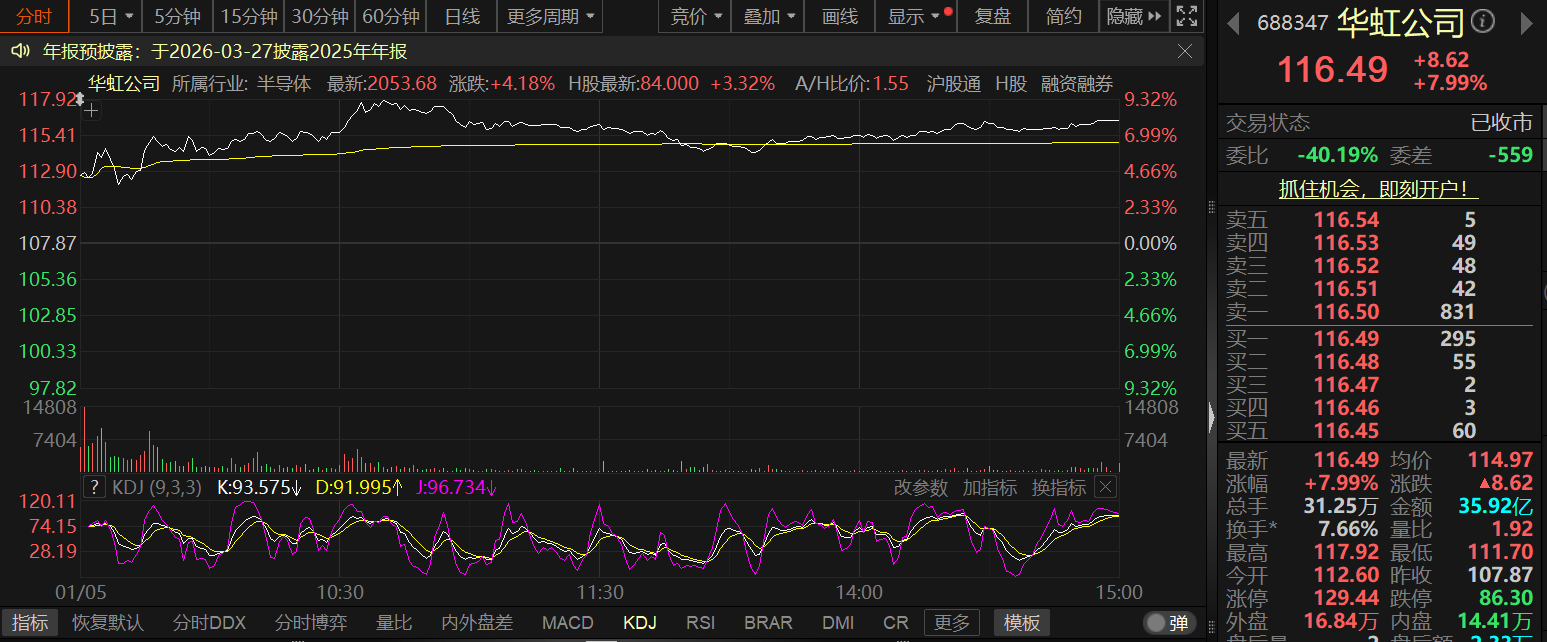 截至1月5日日间收盘,华虹公司以7.99%的涨幅报116.49元/股。