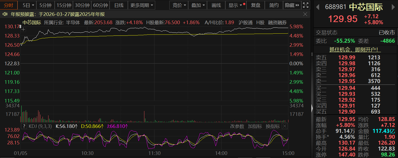 截至1月5日收盘,中芯国际以5.8%的涨幅报129.95元/股。
