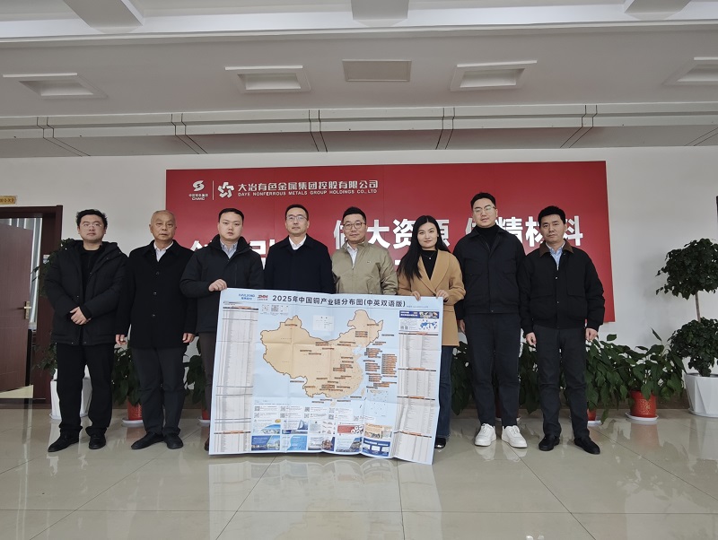 1月5日,上海有色网信息科技股份有限公司(SMM) CEO 卢嘉龙、SMM大数据总监叶建华、 SMM营销部副总经理&铜事业部总经理马瑶、SMM铜事业部副总经理任杰等一行,到大冶有色金属集团控股有限公司开展走访交流。受到了湖北省铜业协会执行秘书长伍宏根, 大冶有色金属集团控股有限公司党委副书记、总经理肖述欣, 大冶国贸公司总经理 李立 ,晟祥铜业公司董事长冯俊,冶炼厂副厂长赵祥林, 大冶国贸公司铜产品部经理余章毅等领导的热情接待。双方就有色金属行业发展现状与未来趋势展开深度探讨。