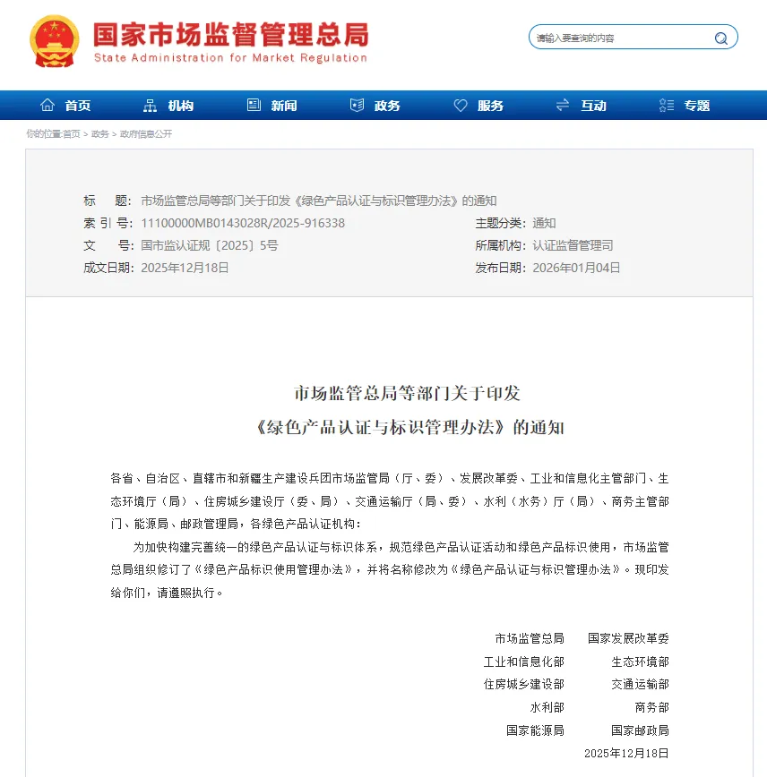 1月4日,国家市场监管总局会同其他9个有关部门修订发布《绿色产品认证与标识管理办法》。