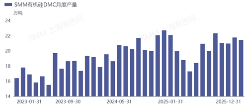 据SMM数据统计,2025年12月国内有机硅DMC产量约21.43万吨,按日均产量计算,12月单日产量环比11月下降幅度约4.69%,同比看,下降约5.59%。12月供应端缩量的主要因素为单体企业联合减排政策落地执行,大多单体厂生产负荷逐步下调,从而使得整体产量下行。