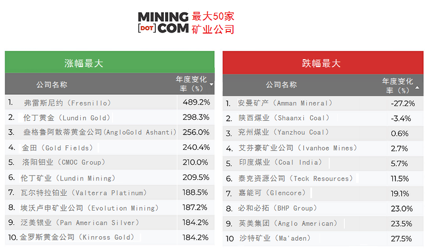 表现最佳的企业多为金银公司,其中包括股价飙升5倍的弗雷斯尼约公司(Fresnillo),这家在伦敦上市的银矿公司由墨西哥佩诺莱斯(Peñoles)控股。经过多年排名起伏不定后,该公司如今已经稳列榜单中游。
